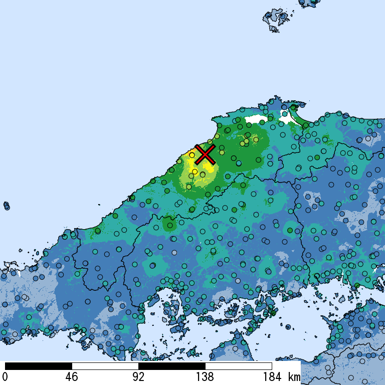 解析開始時点(2018/04/09 01:42:42)で収集されている防災科研K-NET, KiK-net, 気象庁, 地方公共団体震度計の計測震度データを利用。 (*)気象庁発表の情報と一致しない場合がある。 一部正式な震度観測点ではない観測点を含む。暫定的な震度値を含む。丸印は観測、塗りつぶしは推定データ。×印は震央位置。 他の図表も同様。