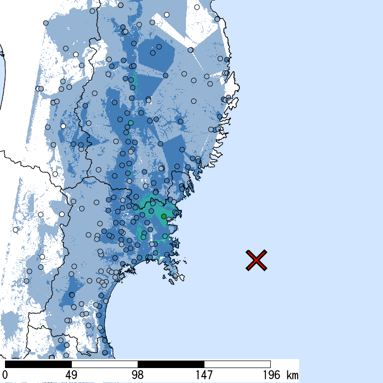 解析開始時点(2025/06/02 11:36:40)で収集されている防災科研K-NET, KiK-net, 気象庁, 地方公共団体震度計の計測震度データを利用。 (*)気象庁発表の情報と一致しない場合がある。 一部正式な震度観測点ではない観測点を含む。暫定的な震度値を含む。丸印は観測、塗りつぶしは推定データ。×印は震央位置。 他の図表も同様。