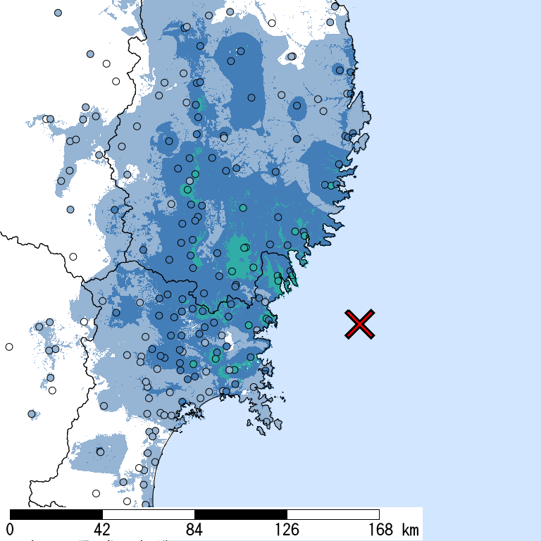 | 2011 | 宮城県沖 | 7.2 | 東北地方太平洋沖地震の震源域内の地震だが,太平洋プレートの逆断層型スラブ内地震(深さ66km).死4,傷296,住家全壊36以上,半壊27以上(消防庁・宮城県による;2016年3月現在).最大震度6強(宮城県仙台市・栗原市),6弱が宮城県15市町村,岩手県6市町. |