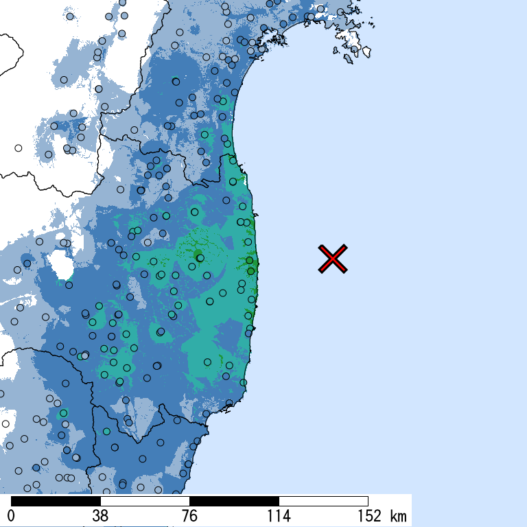 2011 宮城県沖 7.2 東北地方太平洋沖地震の震源域内の地震だが,太平洋プレートの逆断層型スラブ内地震(深さ66km).死4,傷296,住家全壊36以上,半壊27以上(消防庁・宮城県による;2016年3月現在).最大震度6強(宮城県仙台市・栗原市),6弱が宮城県15市町村,岩手県6市町.