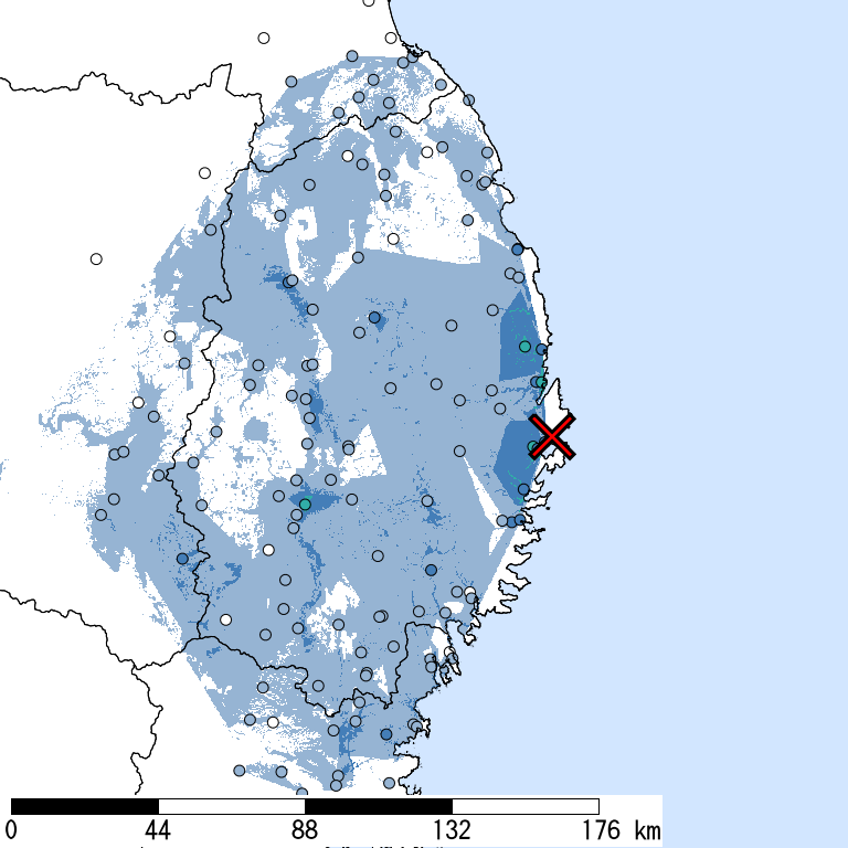 解析開始時点(2025/10/14 07:09:30)で収集されている防災科研K-NET, KiK-net, 気象庁, 地方公共団体震度計の計測震度データを利用。 (*)気象庁発表の情報と一致しない場合がある。 一部正式な震度観測点ではない観測点を含む。暫定的な震度値を含む。丸印は観測、塗りつぶしは推定データ。×印は震央位置。 他の図表も同様。