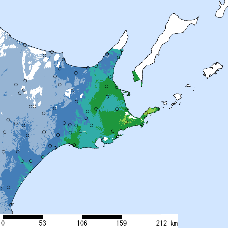 解析開始時点(2025/10/25 01:43:24)で収集されている防災科研K-NET, KiK-net, 気象庁, 地方公共団体震度計の計測震度データを利用。 (*)気象庁発表の情報と一致しない場合がある。 一部正式な震度観測点ではない観測点を含む。暫定的な震度値を含む。丸印は観測、塗りつぶしは推定データ。×印は震央位置。 他の図表も同様。