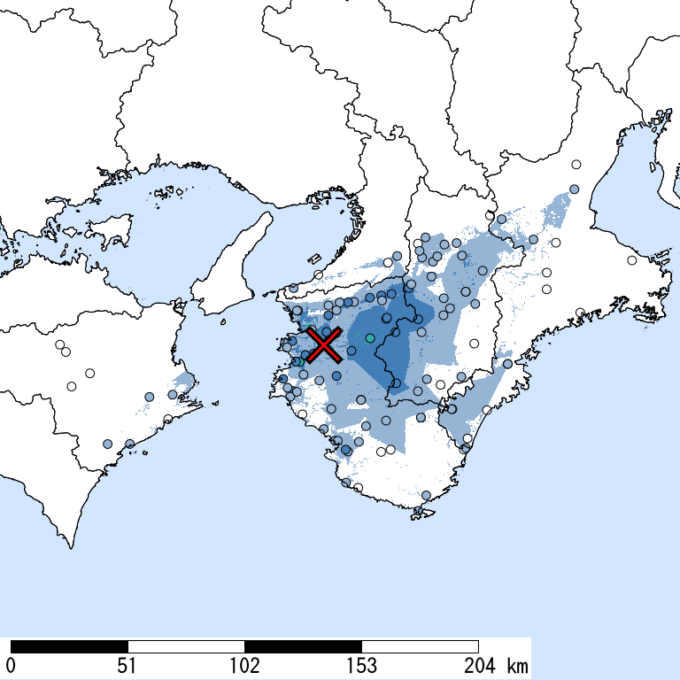 解析開始時点(2025/11/02 07:34:59)で収集されている防災科研K-NET, KiK-net, 気象庁, 地方公共団体震度計の計測震度データを利用。 (*)気象庁発表の情報と一致しない場合がある。 一部正式な震度観測点ではない観測点を含む。暫定的な震度値を含む。丸印は観測、塗りつぶしは推定データ。×印は震央位置。 他の図表も同様。