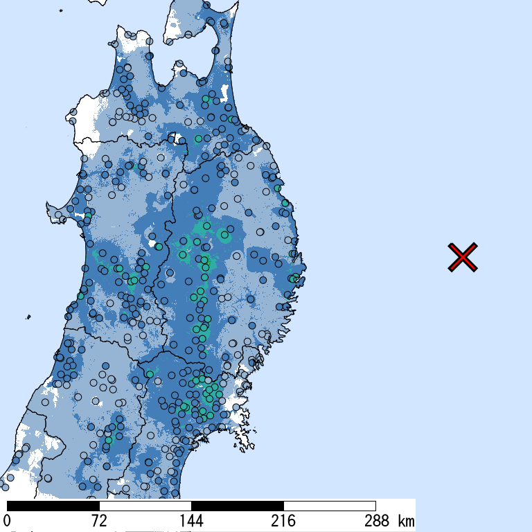 解析開始時点(2025/11/10 16:34:23)で収集されている防災科研K-NET, KiK-net, 気象庁, 地方公共団体震度計の計測震度データを利用。 (*)気象庁発表の情報と一致しない場合がある。 一部正式な震度観測点ではない観測点を含む。暫定的な震度値を含む。丸印は観測、塗りつぶしは推定データ。×印は震央位置。 他の図表も同様。