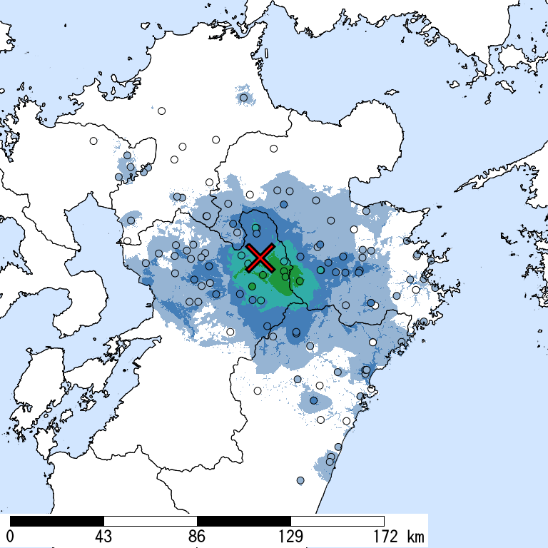 解析開始時点(2025/11/25 22:09:22)で収集されている防災科研K-NET, KiK-net, 気象庁, 地方公共団体震度計の計測震度データを利用。 (*)気象庁発表の情報と一致しない場合がある。 一部正式な震度観測点ではない観測点を含む。暫定的な震度値を含む。丸印は観測、塗りつぶしは推定データ。×印は震央位置。 他の図表も同様。