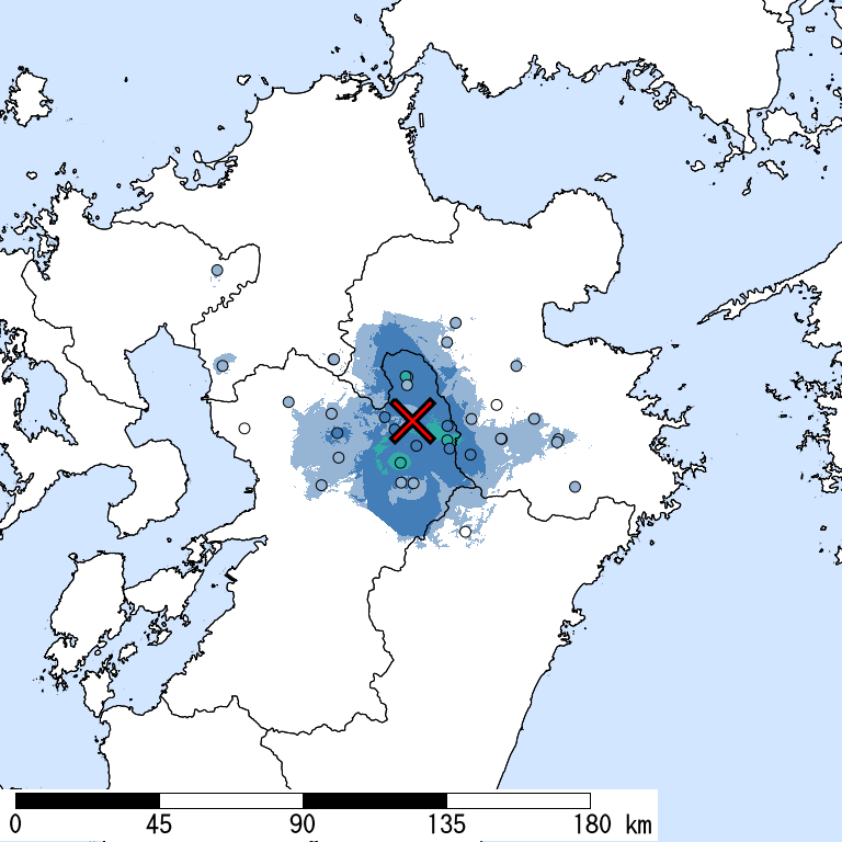 解析開始時点(2025/11/25 23:58:33)で収集されている防災科研K-NET, KiK-net, 気象庁, 地方公共団体震度計の計測震度データを利用。 (*)気象庁発表の情報と一致しない場合がある。 一部正式な震度観測点ではない観測点を含む。暫定的な震度値を含む。丸印は観測、塗りつぶしは推定データ。×印は震央位置。 他の図表も同様。