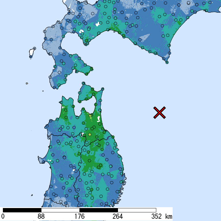 解析開始時点(2025/12/12 11:48:07)で収集されている防災科研K-NET, KiK-net, 気象庁, 地方公共団体震度計の計測震度データを利用。 (*)気象庁発表の情報と一致しない場合がある。 一部正式な震度観測点ではない観測点を含む。暫定的な震度値を含む。丸印は観測、塗りつぶしは推定データ。×印は震央位置。 他の図表も同様。
