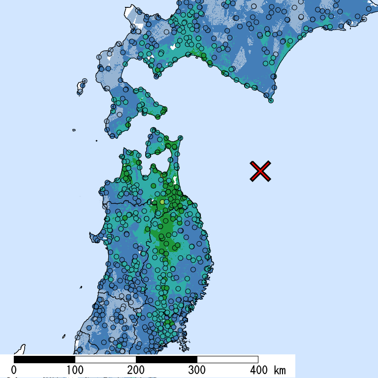 解析開始時点(2025/12/12 11:51:18)で収集されている防災科研K-NET, KiK-net, 気象庁, 地方公共団体震度計の計測震度データを利用。 (*)気象庁発表の情報と一致しない場合がある。 一部正式な震度観測点ではない観測点を含む。暫定的な震度値を含む。丸印は観測、塗りつぶしは推定データ。×印は震央位置。 他の図表も同様。