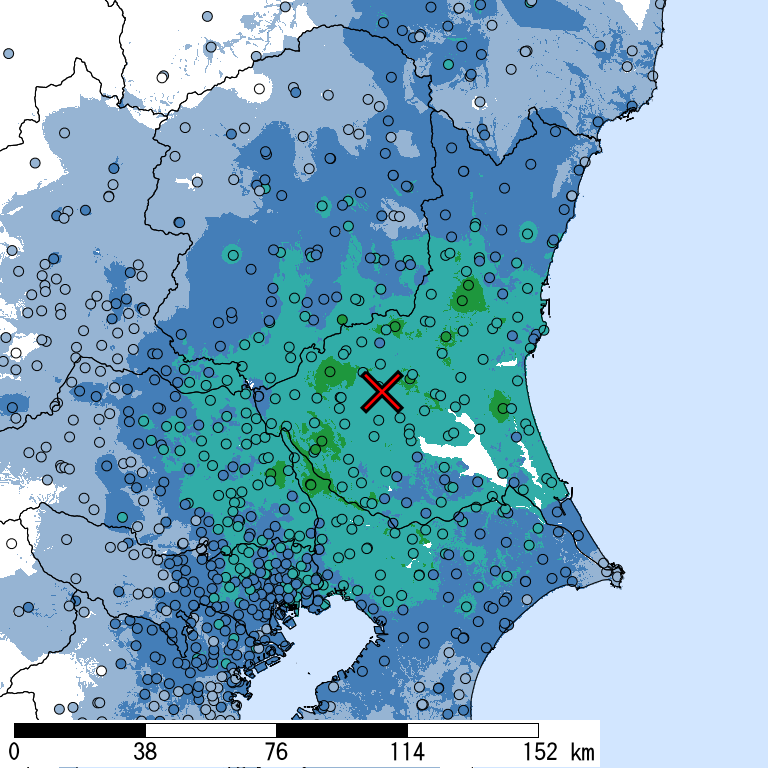 解析開始時点(2025/12/12 19:15:43)で収集されている防災科研K-NET, KiK-net, 気象庁, 地方公共団体震度計の計測震度データを利用。 (*)気象庁発表の情報と一致しない場合がある。 一部正式な震度観測点ではない観測点を含む。暫定的な震度値を含む。丸印は観測、塗りつぶしは推定データ。×印は震央位置。 他の図表も同様。