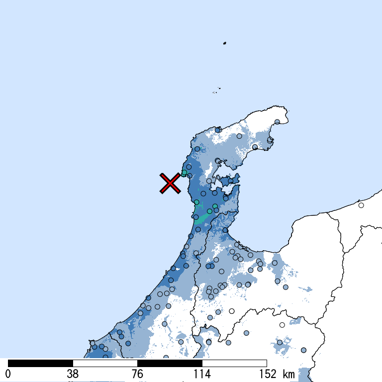 1952 石川県西方沖 (大聖寺沖地震) 6.5 福井・石川両県で死7,家屋半壊4など.山崩れや道路の亀裂などもあった.