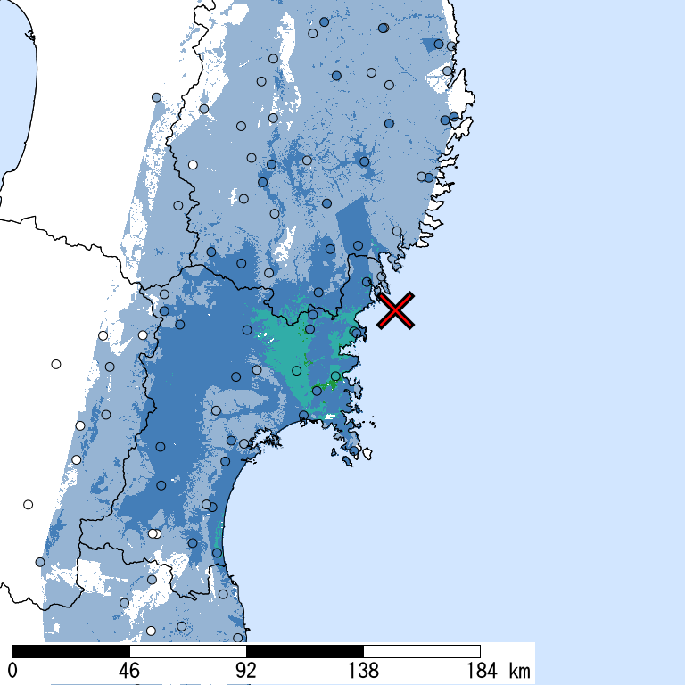 解析開始時点(2025/12/16 11:49:29)で収集されている防災科研K-NET, KiK-net, 気象庁, 地方公共団体震度計の計測震度データを利用。 (*)気象庁発表の情報と一致しない場合がある。 一部正式な震度観測点ではない観測点を含む。暫定的な震度値を含む。丸印は観測、塗りつぶしは推定データ。×印は震央位置。 他の図表も同様。