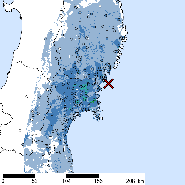 市区町村名 全て表示 | 全人口:昼間 (人) | 震央距離 (km) |