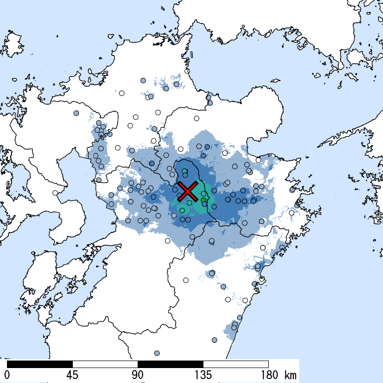 解析開始時点(2025/12/29 07:45:32)で収集されている防災科研K-NET, KiK-net, 気象庁, 地方公共団体震度計の計測震度データを利用。 (*)気象庁発表の情報と一致しない場合がある。 一部正式な震度観測点ではない観測点を含む。暫定的な震度値を含む。丸印は観測、塗りつぶしは推定データ。×印は震央位置。 他の図表も同様。