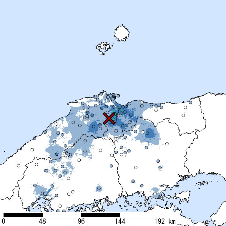 解析開始時点(2026/01/07 18:49:22)で収集されている防災科研K-NET, KiK-net, 気象庁, 地方公共団体震度計の計測震度データを利用。 (*)気象庁発表の情報と一致しない場合がある。 一部正式な震度観測点ではない観測点を含む。暫定的な震度値を含む。丸印は観測、塗りつぶしは推定データ。×印は震央位置。 他の図表も同様。