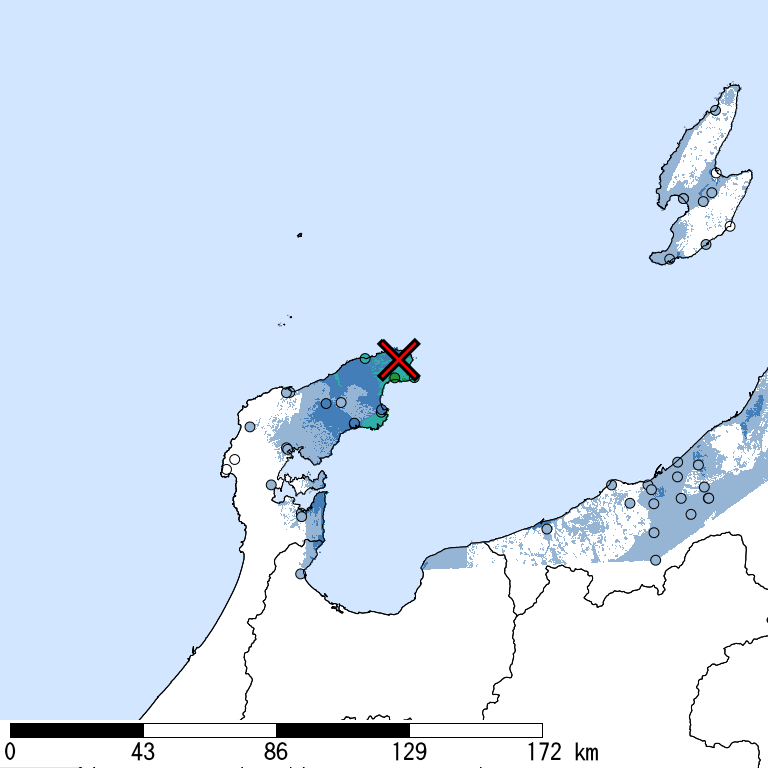 解析開始時点(2026/01/13 05:14:09)で収集されている防災科研K-NET, KiK-net, 気象庁, 地方公共団体震度計の計測震度データを利用。 (*)気象庁発表の情報と一致しない場合がある。 一部正式な震度観測点ではない観測点を含む。暫定的な震度値を含む。丸印は観測、塗りつぶしは推定データ。×印は震央位置。 他の図表も同様。
