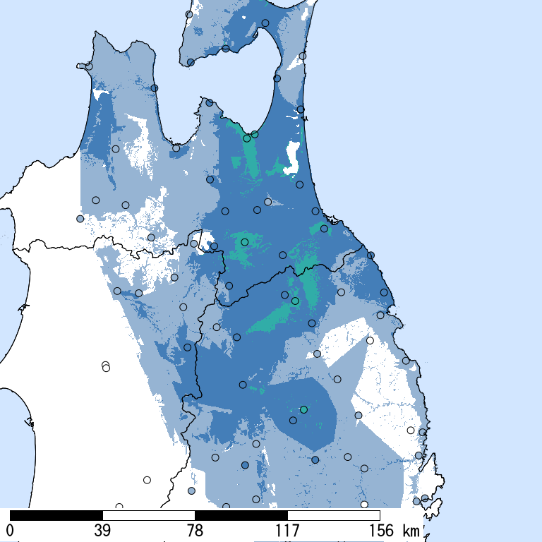 解析開始時点(2026/01/17 04:35:31)で収集されている防災科研K-NET, KiK-net, 気象庁, 地方公共団体震度計の計測震度データを利用。 (*)気象庁発表の情報と一致しない場合がある。 一部正式な震度観測点ではない観測点を含む。暫定的な震度値を含む。丸印は観測、塗りつぶしは推定データ。×印は震央位置。 他の図表も同様。