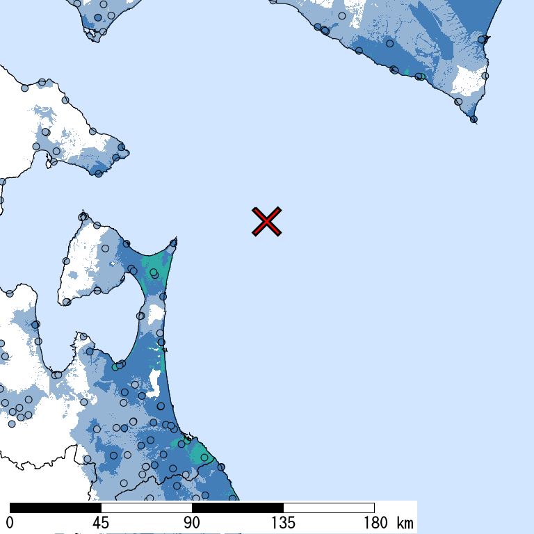 解析開始時点(2026/01/21 03:02:23)で収集されている防災科研K-NET, KiK-net, 気象庁, 地方公共団体震度計の計測震度データを利用。 (*)気象庁発表の情報と一致しない場合がある。 一部正式な震度観測点ではない観測点を含む。暫定的な震度値を含む。丸印は観測、塗りつぶしは推定データ。×印は震央位置。 他の図表も同様。