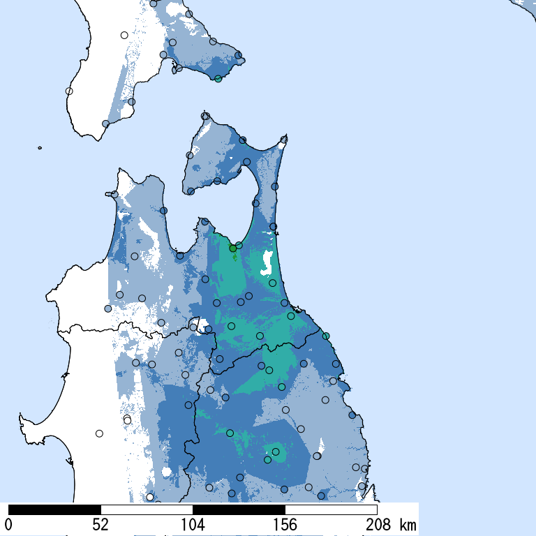 解析開始時点(2026/01/22 23:33:47)で収集されている防災科研K-NET, KiK-net, 気象庁, 地方公共団体震度計の計測震度データを利用。 (*)気象庁発表の情報と一致しない場合がある。 一部正式な震度観測点ではない観測点を含む。暫定的な震度値を含む。丸印は観測、塗りつぶしは推定データ。×印は震央位置。 他の図表も同様。