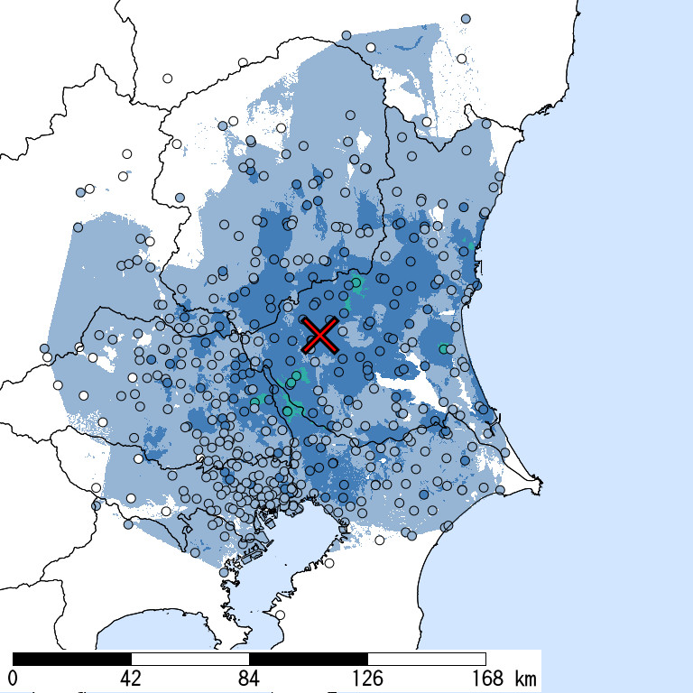 解析開始時点(2026/01/25 11:51:02)で収集されている防災科研K-NET, KiK-net, 気象庁, 地方公共団体震度計の計測震度データを利用。 (*)気象庁発表の情報と一致しない場合がある。 一部正式な震度観測点ではない観測点を含む。暫定的な震度値を含む。丸印は観測、塗りつぶしは推定データ。×印は震央位置。 他の図表も同様。