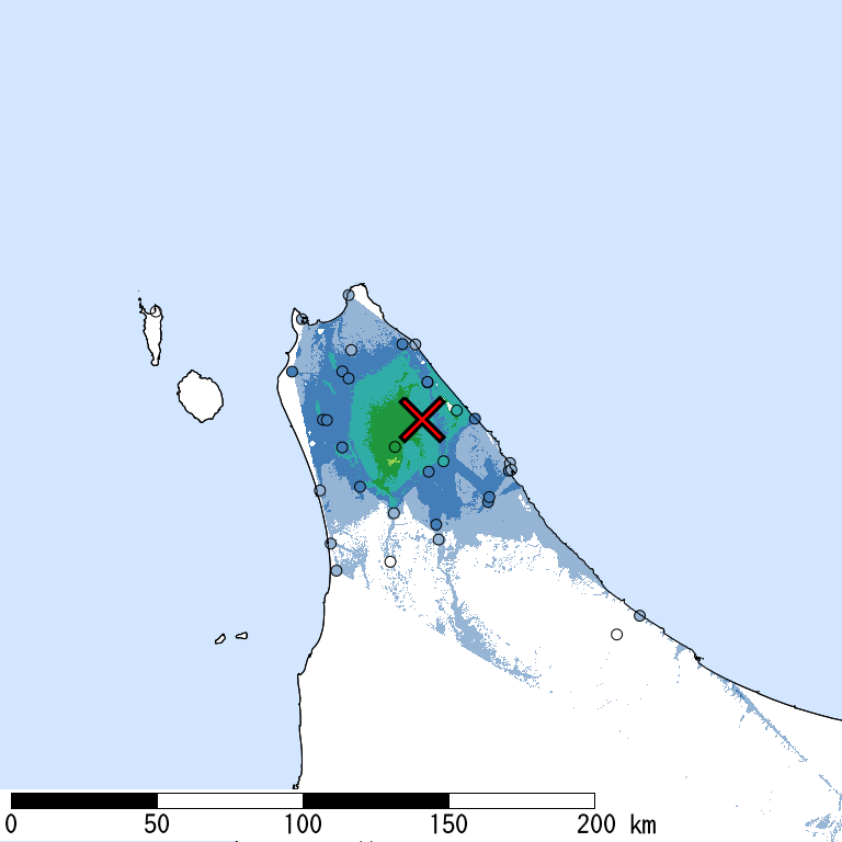 この地域では、震央位置がはっきりわかっている