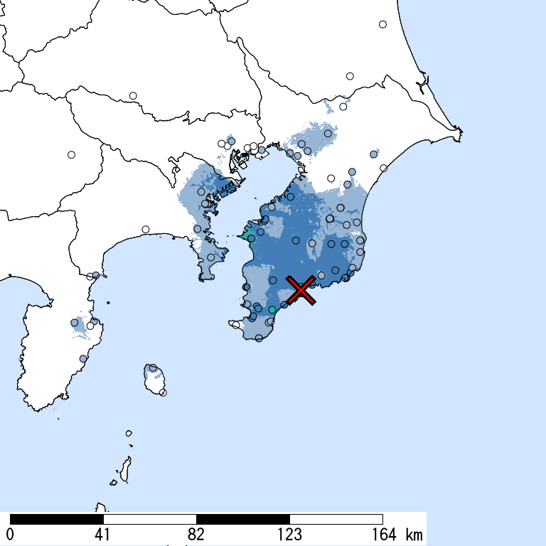 市区町村名 全て表示 | 全人口:昼間 (人) | 震央距離 (km) |