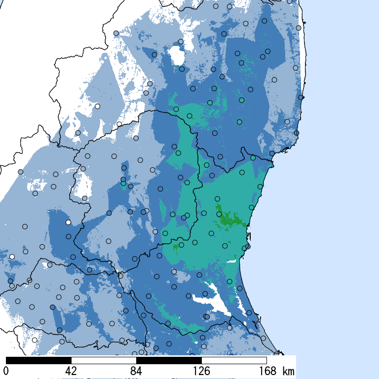 解析開始時点(2026/02/03 18:04:42)で収集されている防災科研K-NET, KiK-net, 気象庁, 地方公共団体震度計の計測震度データを利用。 (*)気象庁発表の情報と一致しない場合がある。 一部正式な震度観測点ではない観測点を含む。暫定的な震度値を含む。丸印は観測、塗りつぶしは推定データ。×印は震央位置。 他の図表も同様。