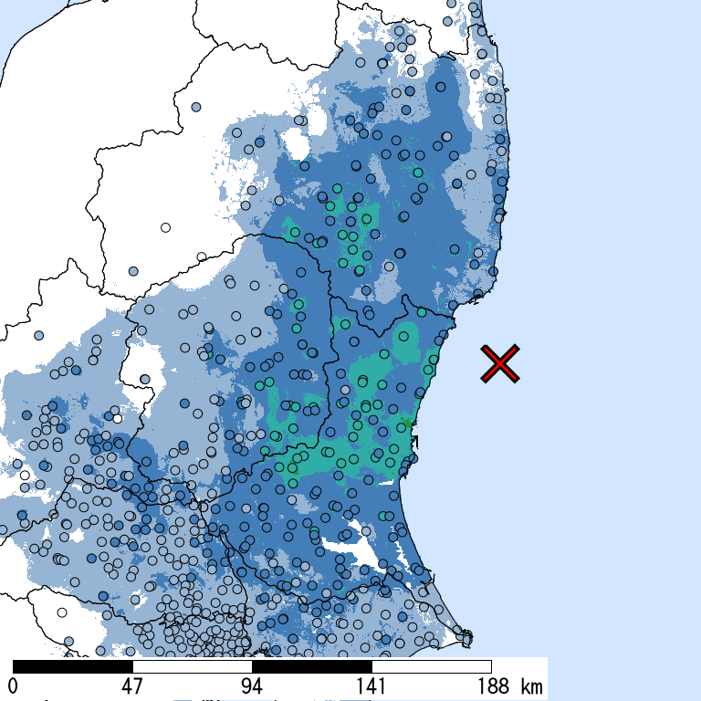 解析開始時点(2026/02/03 18:13:43)で収集されている防災科研K-NET, KiK-net, 気象庁, 地方公共団体震度計の計測震度データを利用。 (*)気象庁発表の情報と一致しない場合がある。 一部正式な震度観測点ではない観測点を含む。暫定的な震度値を含む。丸印は観測、塗りつぶしは推定データ。×印は震央位置。 他の図表も同様。