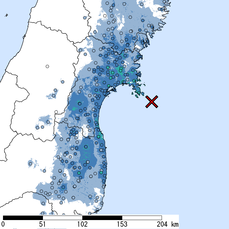 2011 宮城県沖 7.2 東北地方太平洋沖地震の震源域内の地震だが,太平洋プレートの逆断層型スラブ内地震(深さ66km).死4,傷296,住家全壊36以上,半壊27以上(消防庁・宮城県による;2016年3月現在).最大震度6強(宮城県仙台市・栗原市),6弱が宮城県15市町村,岩手県6市町.
